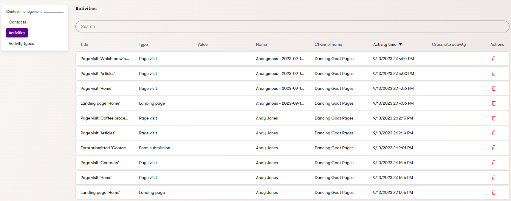 Activities represent actions that your contacts perform. For example, the system logs activities when visitors view pages or submit forms on the site.