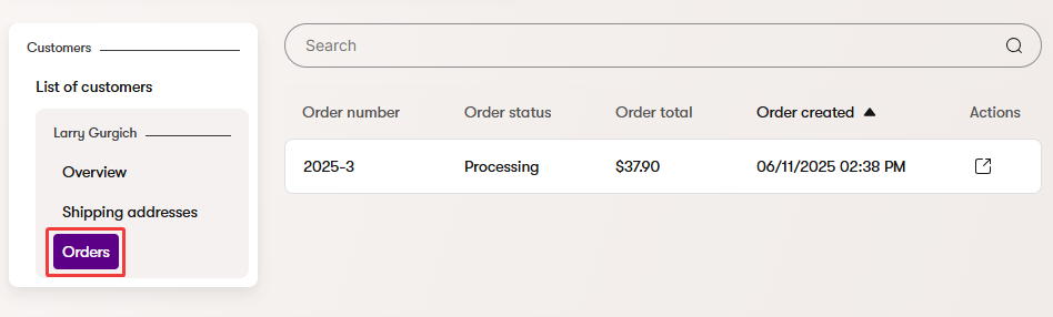 - Navigate to the Orders tab to view a list of orders created by the selected customer.
