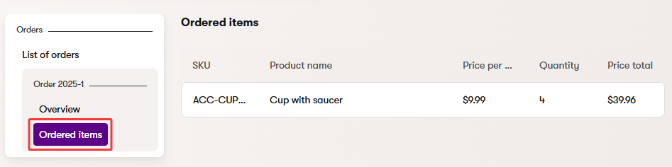 - Navigate to the Ordered items tab to view a list of products in the order.
