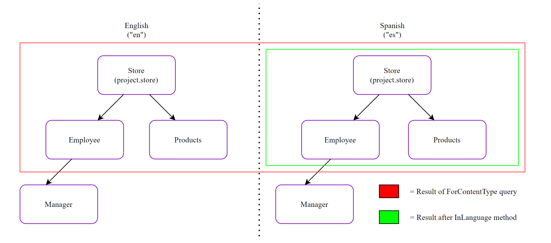 The following diagram illustrates the behavior on a simple content model. Red arrows trace query evaluation: