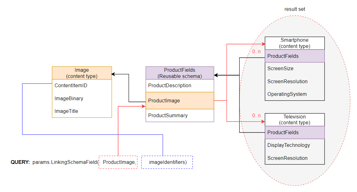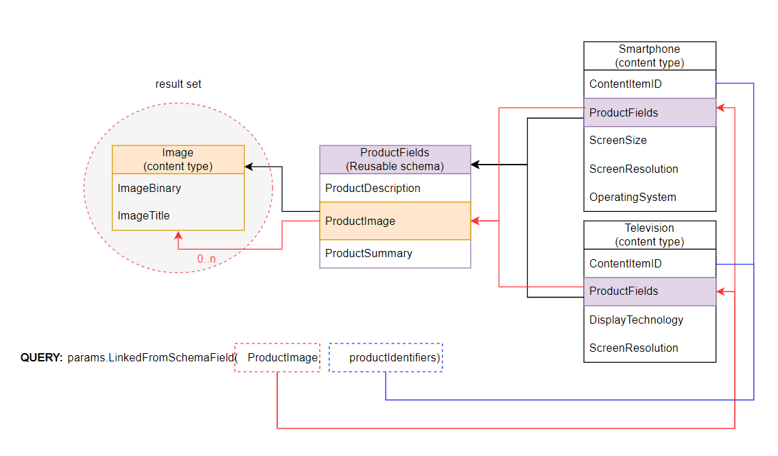 See the following diagram for an illustration of the method’s behavior on a simplified content model. The query retrieves all content items that link to the images from imageIdentifiers via the ProductImage reusable schema field. Red arrows trace the query evaluation: