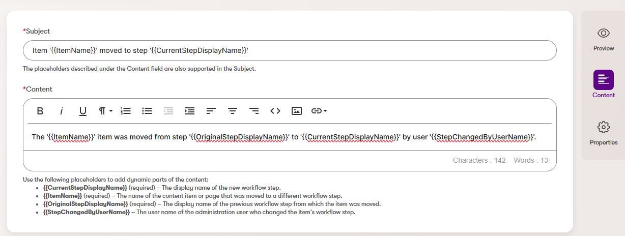 As of version 30.8.0, Xperience includes built-in workflow notifications. You don’t have to create custom workflow notifications unless you need further customization.