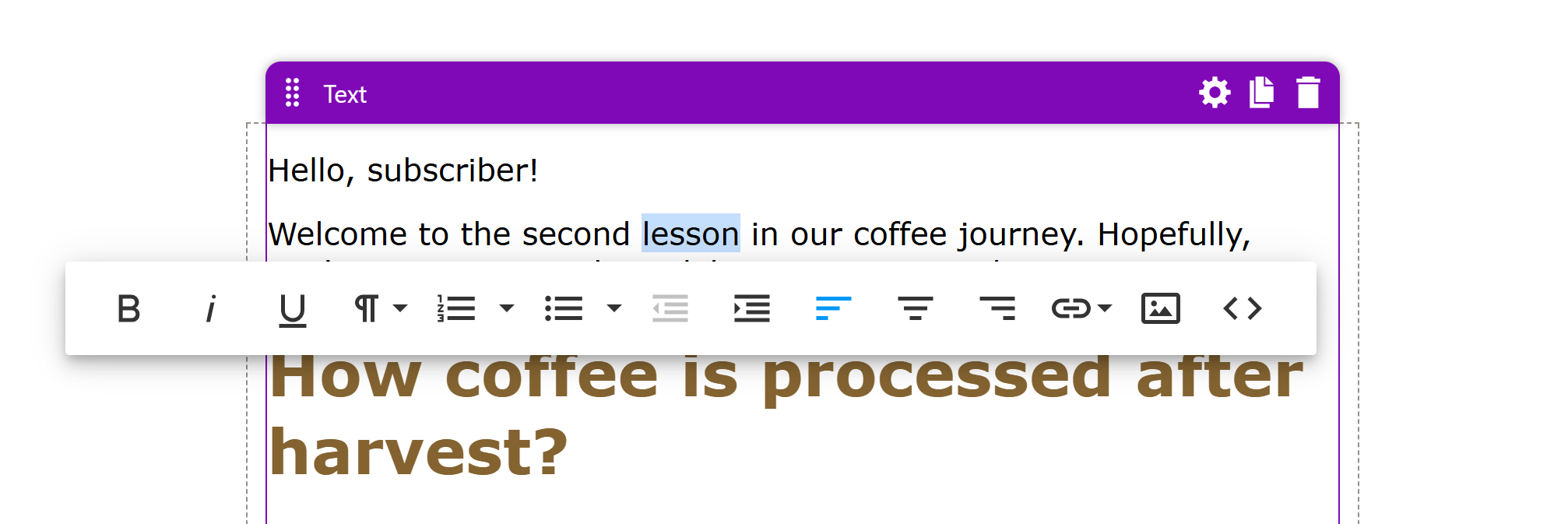 Inline editors allow users to enter values for the properties of Email Builder widgets. They can be used as an alternative to the property configuration dialog, or in combination with it.