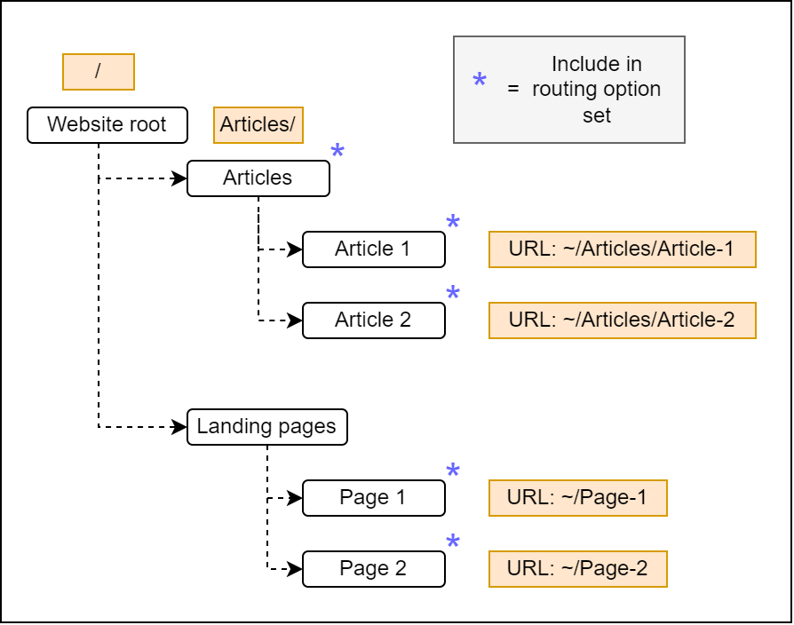 - If an ancestor has the Include in routing option set for its content type, it contributes a segment to the page’s resulting URL. All other ancestors are skipped.