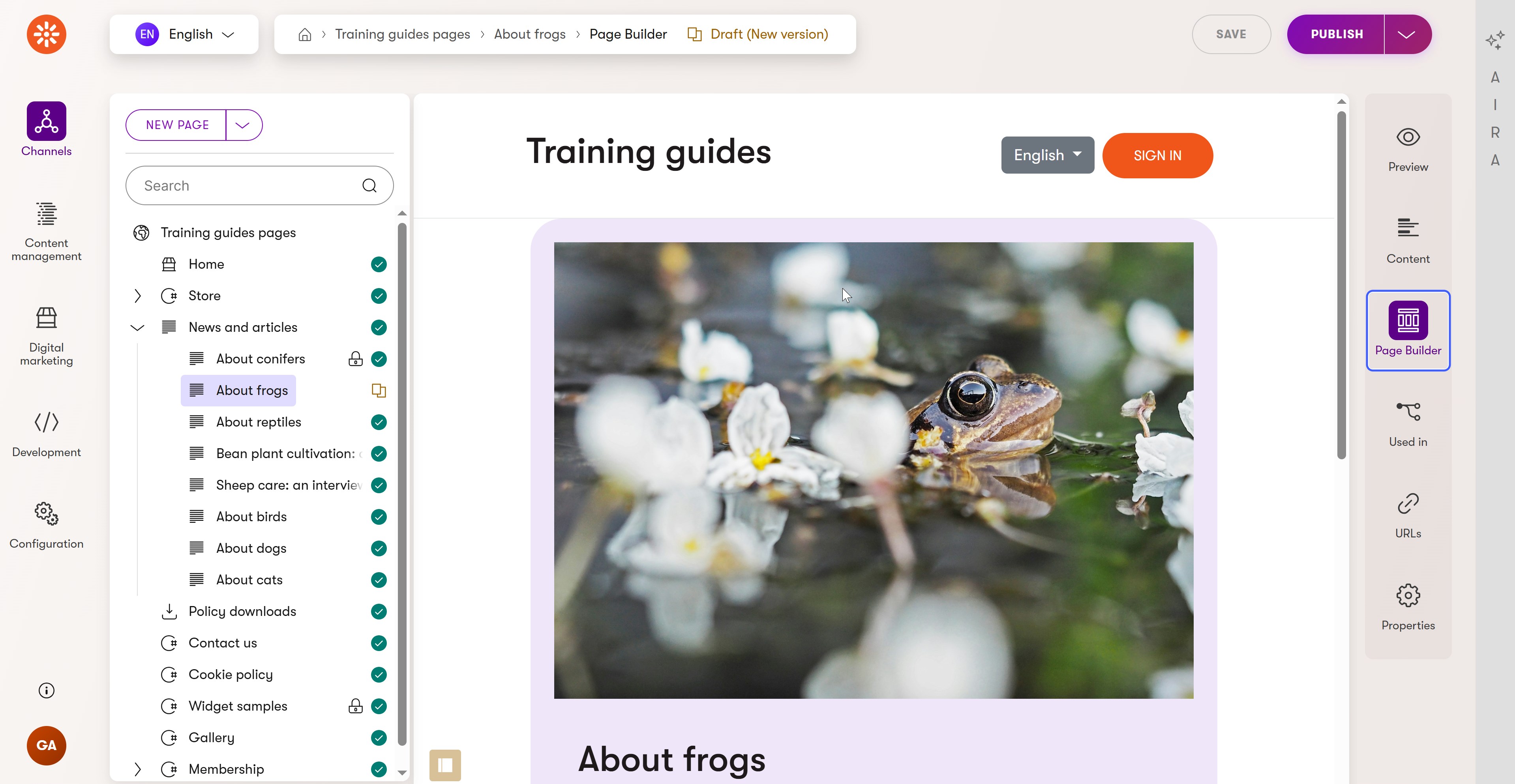 In the content tree of the Training guides pages channel, you’ll find eight children under News and articles: