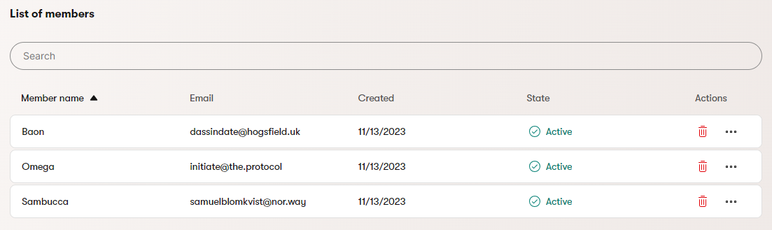 Member accounts are managed using the Members application. The application’s home page lists all member accounts in the system.